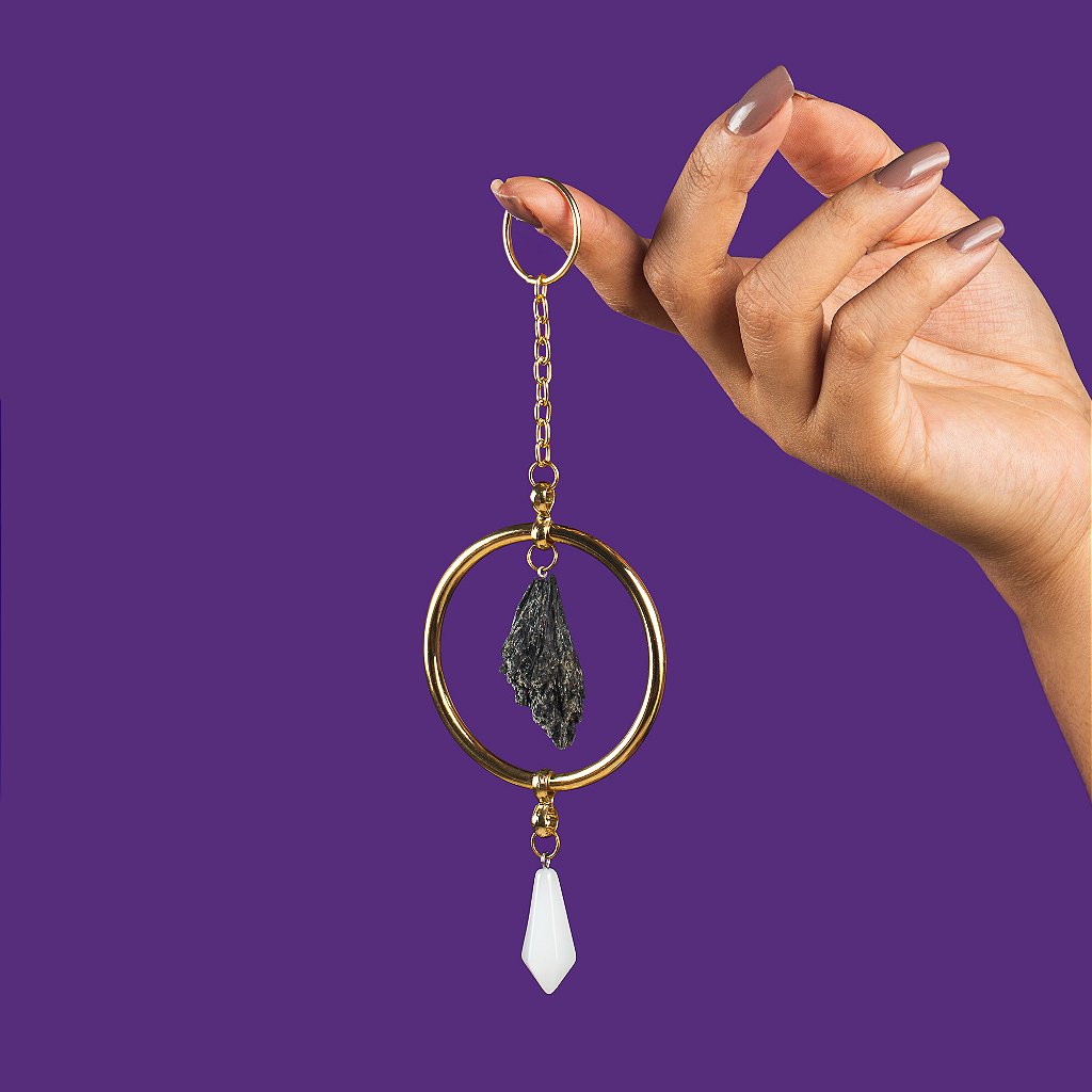 Já o pêndulo em cristal branco fortalece a transmutação energética e ativa uma vibração suave de clareza e intuição. Essa pedra branca traz sensação de paz e foco, deixando o ambiente interno mais calmo e protegido.