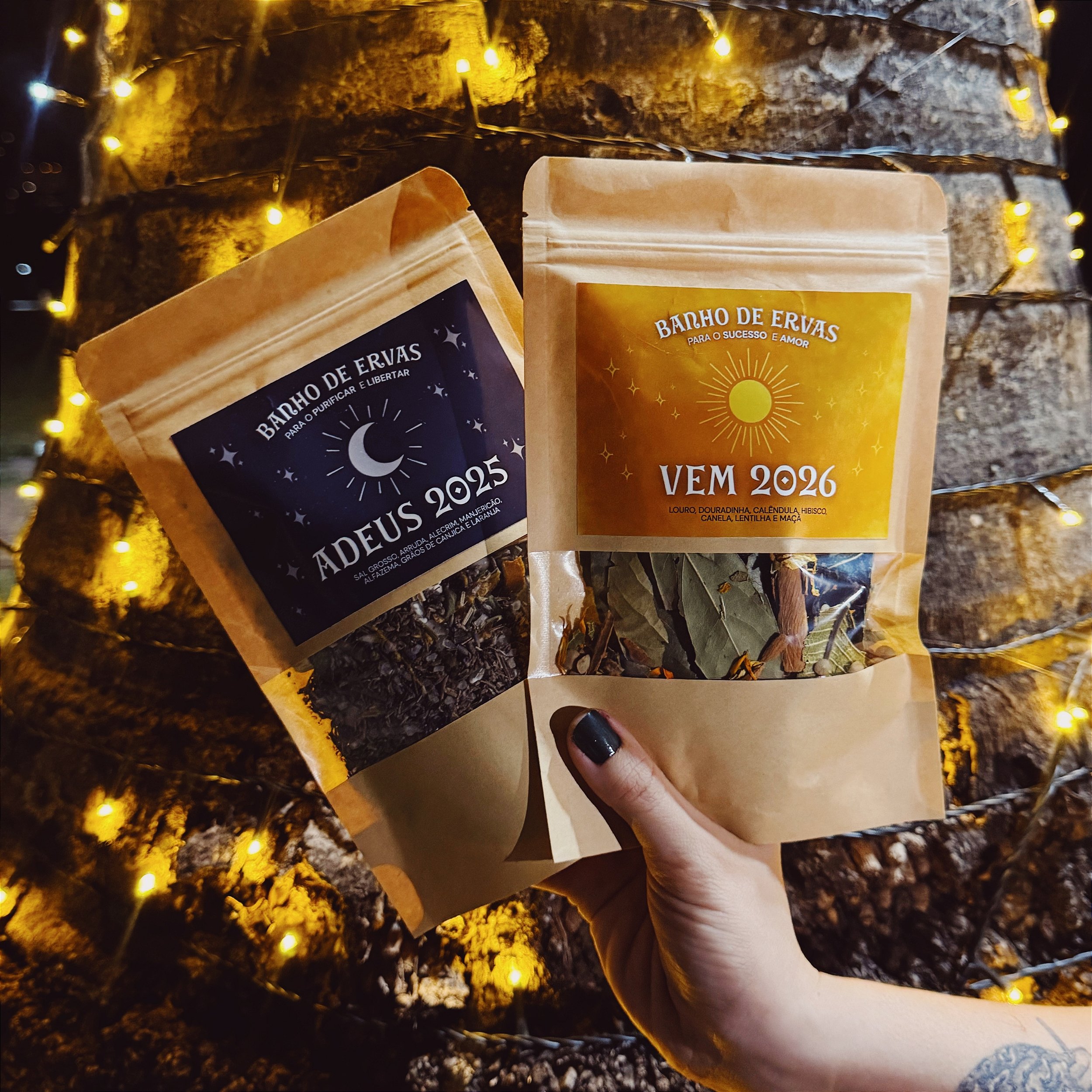 Esse Kit foi pensado para a família, pois possui 1 Banho Adeus 2025 1 Banho Vem 2026 na embalagem grande (cada pacote rende 4 utilizações).