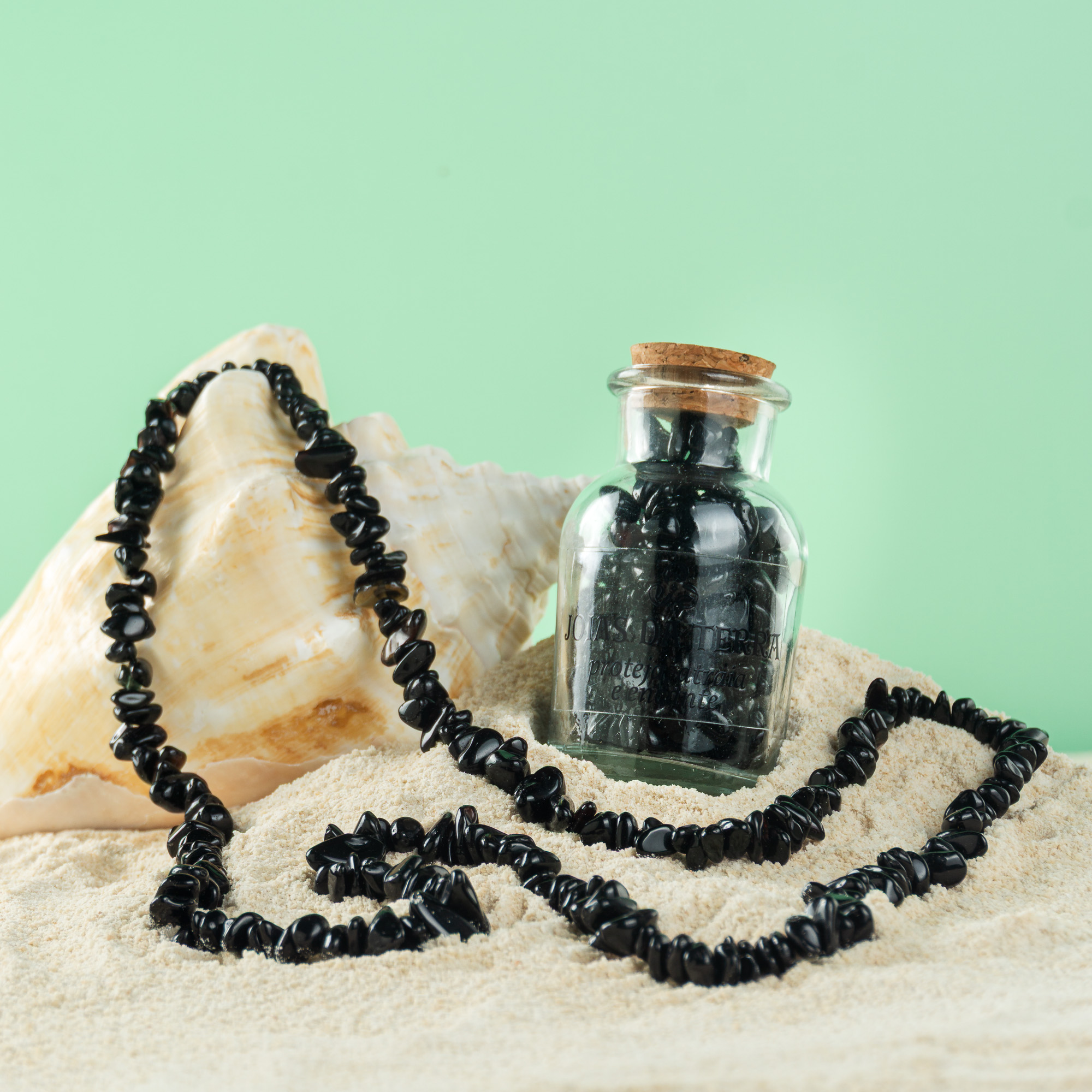 Garrafa Purificadora: Antes de chegar até você, o colar passa por um ritual de purificação na garrafa com pedrinhas de rio. Sempre que sentir necessidade, basta colocá-lo novamente na garrafa para renovar sua energia.