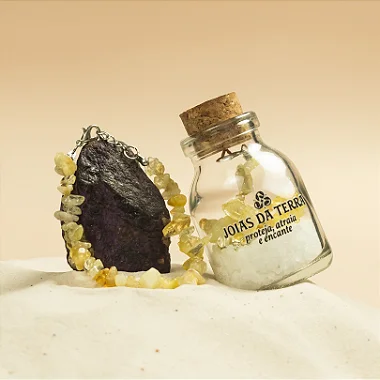 Garrafa Purificadora: Antes de chegar até você, o colar passa por um ritual de purificação na garrafa, agora com uma mistura equilibrada de pedrinhas de dolomita e sal grosso. Essa combinação une estabilidade energética e purificação. Sempre que precisar, basta colocá-lo novamente na garrafa para renovar sua força espiritual.