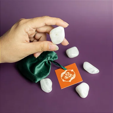 Como presente especial, você recebe uma bolsinha de veludo para guardar seu Quartzo Leitoso com carinho.